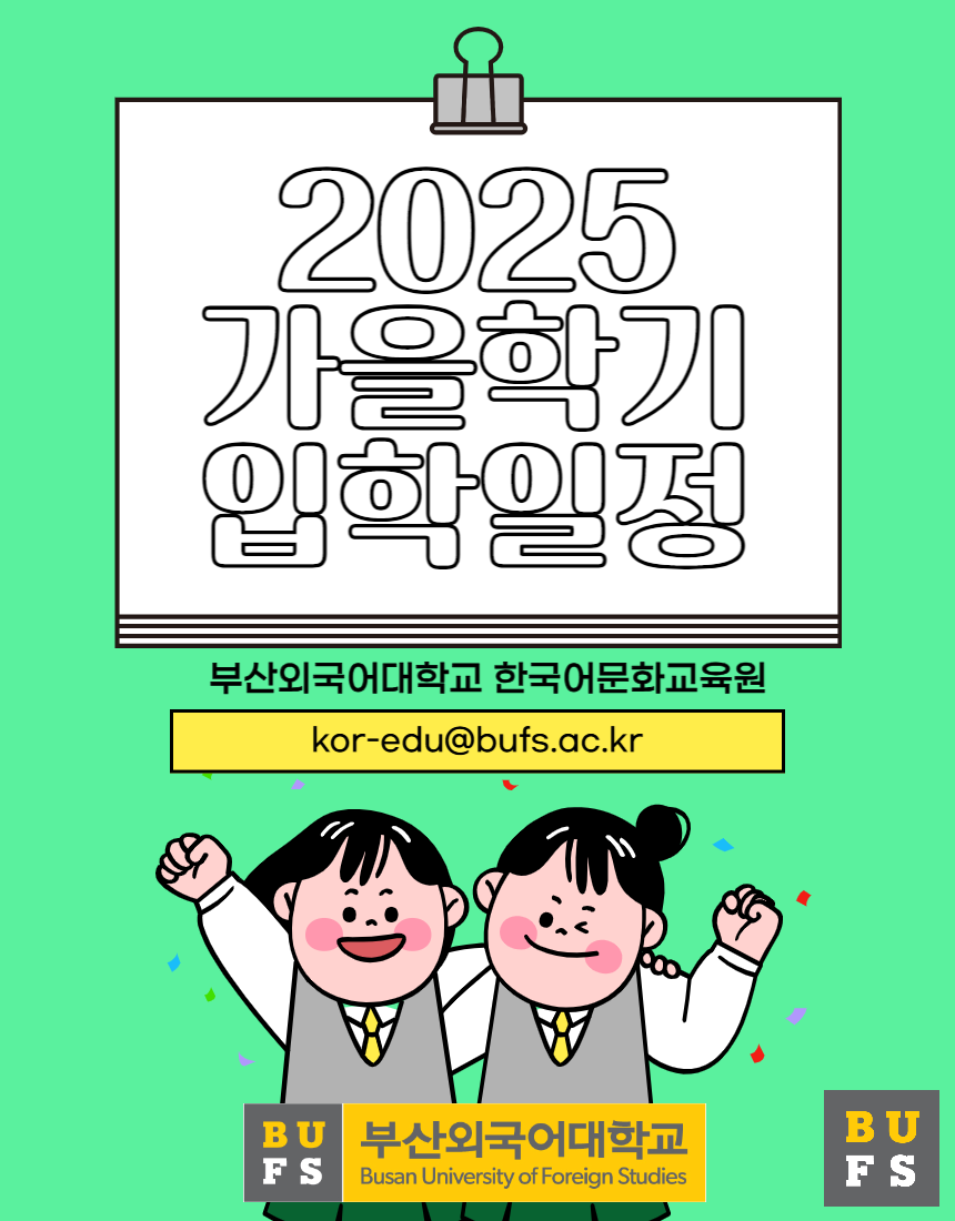 Notice(KLCE) 2025학년도 가을학기 입학일정 안내 한국어문화교육원관리자2025. 5. 30조회수1,249 2025 하계 8월 모집형 단기연…목록2025학년도 한국어도우미 모집(…